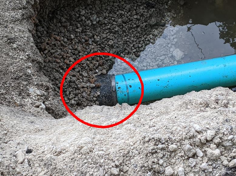 They then filled the trench back up with gravel, yes gravel goes to the side and top of the pipe (I thought code wanted a sand bed under and adjacent to and several inch above or at least if I were repairing or running a new 3" or 4" line the inspector would have required that but since this is not subject to inspection they can do whatever), then they pushed the excavated dirt back into the trench and rolled over the excavated area a few times.