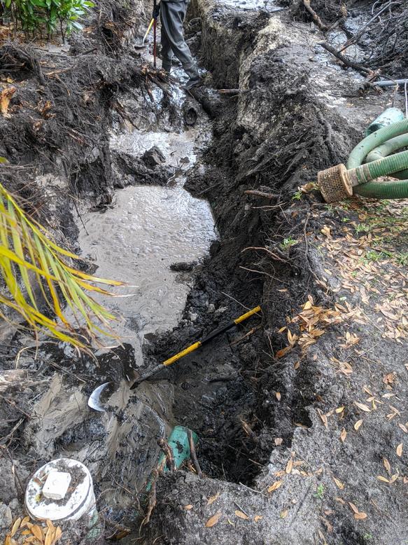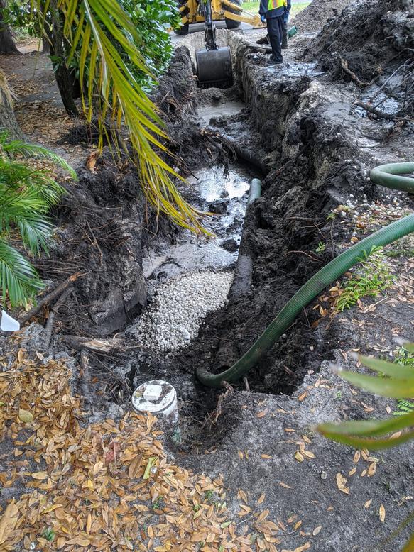 As you can see again 3-4' down they ran into water so they put a pump into the trench and pumped the water out, the other side of the pump where the water evacuated spilled the water everywhere onto the roads, so one of them opened a manhole and extended the outlet hose into the manhole so it dumped the trench water down the sewer.