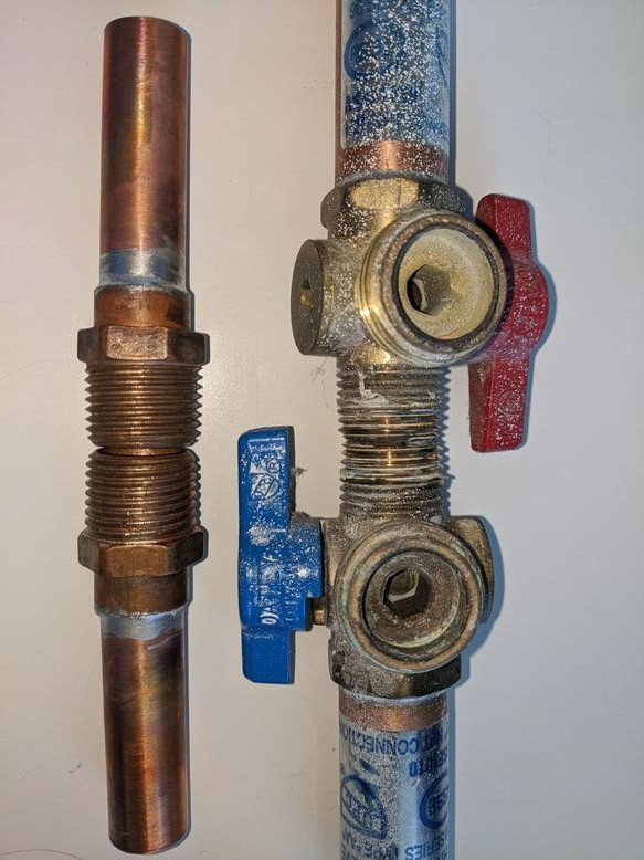 My first attempt was to find the same valves from Oatey, red and blue, 1/2" compression with hammer arrestors. Oddly enough I couldn't find the same ones or similar ones, not compression anyway.