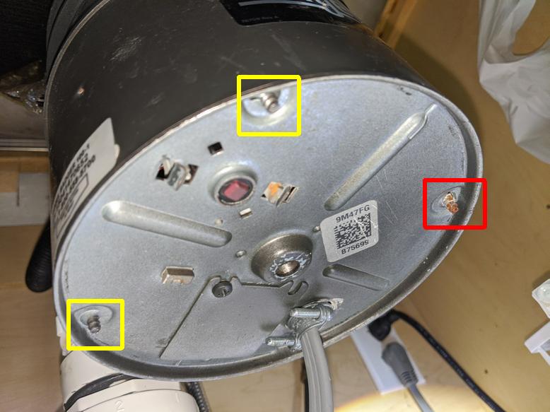 A tenant has jammed the disposer with some debris and I went to free the blades and got it working again, but I had to insert that hex wrench to get it loosened and in the process I noticed a rusted screw on the underside of the unit. There are four screws along the perimeter on the underside of the housing. The ones in yellow are fine, there is one in red that is rusted.