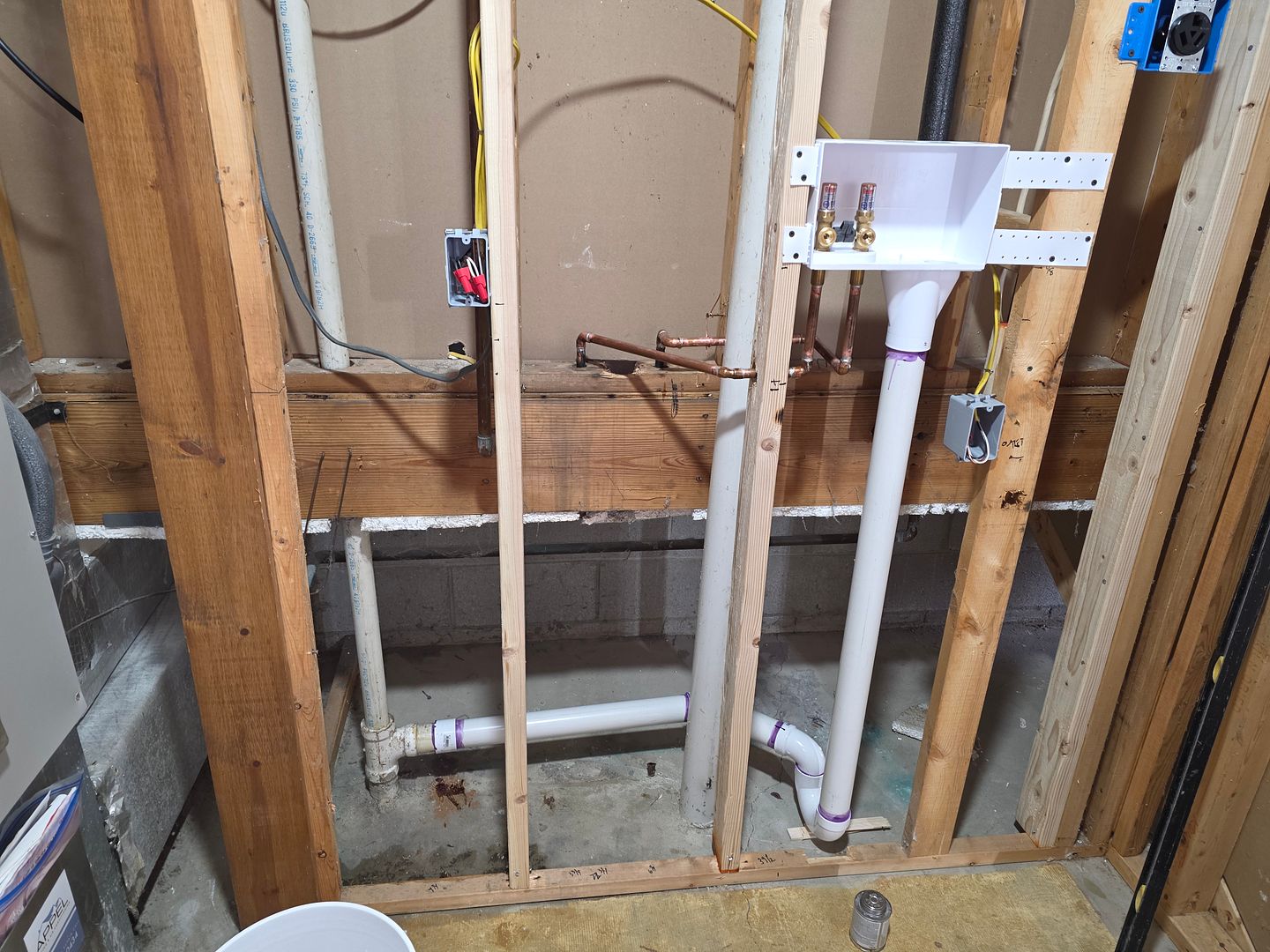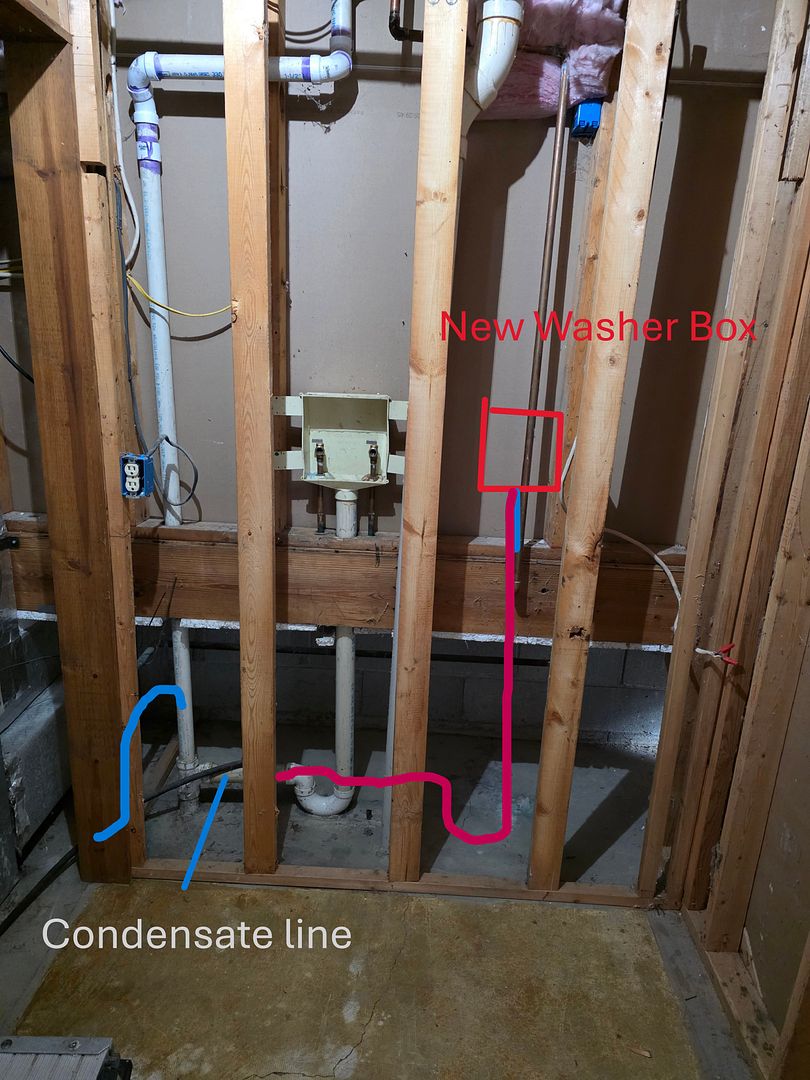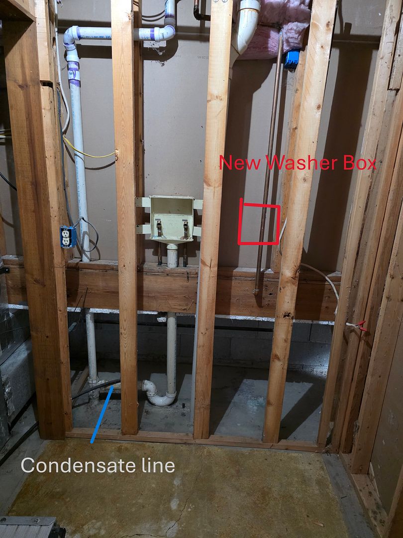 To the left of the framing is the equipment closet that houses the furnace, HW heater, softener, and expansion tank for the well pump. See revised photo below, could I cut into the washer vent and add a second standpipe/trap in the equipment closet? (Blue line in the pic, drawing is not my strong suit.) In addition to the softener drain, I could drain the reverse osmosis system in there as well.