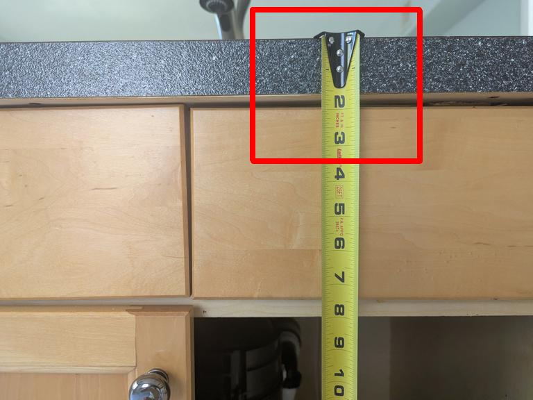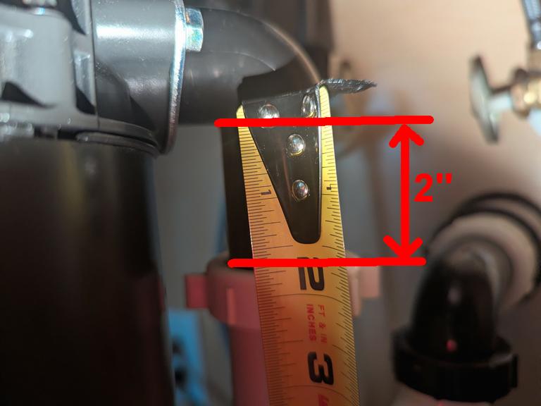 So, if I were to use an 8" deep sink but instead of drop in I do the undermount, the entire sink will be 1-1/2" lower than before. If you look at this picture where I measured the bottom of the disposer outlet elbow to the top of the P-trap inlet, that is only 2". That tells me for an 8" undermount sink, that elbow will insert 1.5" lower, leaving only 1/2 left. If I go with a 10" sink, and undermount it, that elbow coming out of the disposer will be lower than the cabinet drain inlet.