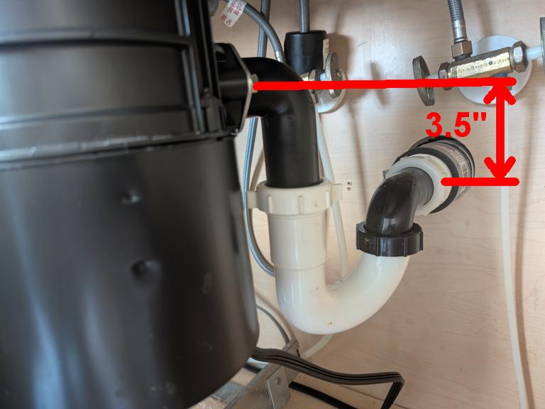 But when I took a closer look, I think the real limit here is the distance from the bottom of the disposer outlet elbow, is 2" higher than where it enters the p-trap U-bend. In other words, I don't think I can lower that disposer more than 2" if I want to keep that elbow.