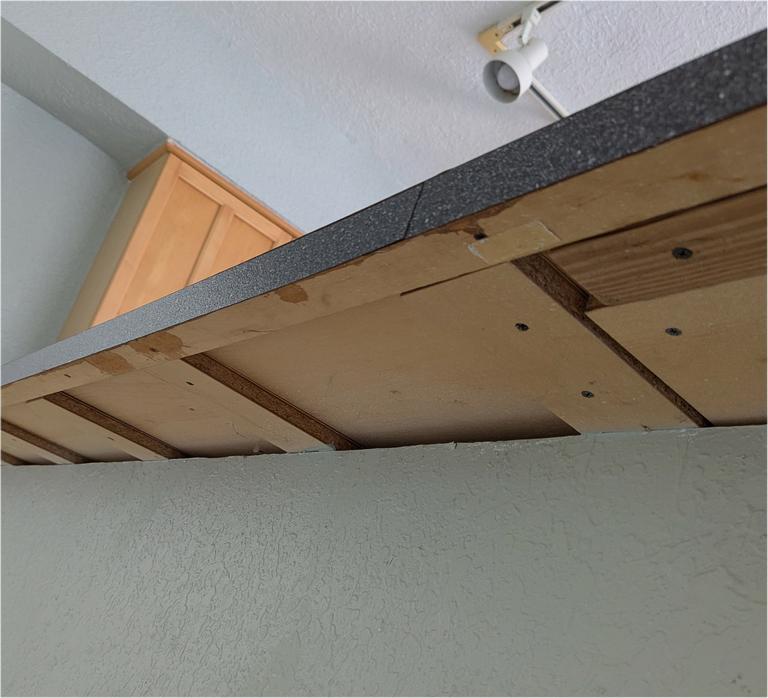It has two layers...basically a layer of 3/4" plywood, and on the underside strips of 3/4" furrings if you will. Here is a picture of a laminated wet bar showing the underside on how they do it. So in this case, the drop in sink sits 1-1/2" above the top of wall or cabinet.