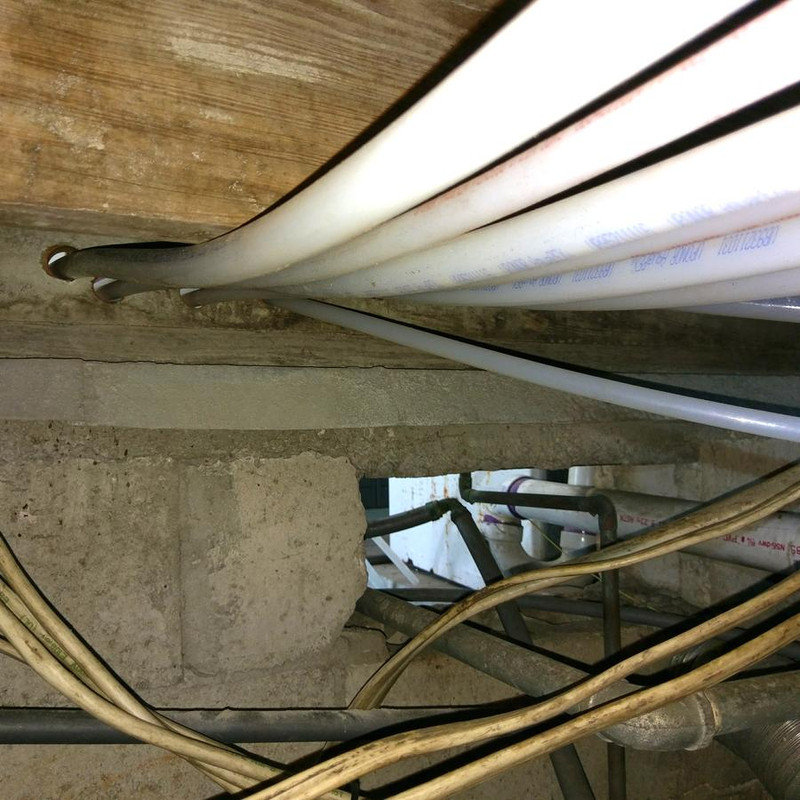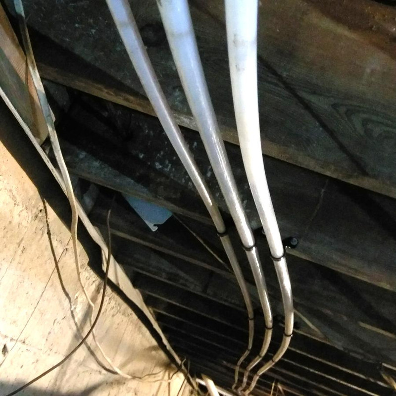 I ran multiple runs of new 1/2" and 3/4" PEX through the crawlspace, attaching to the bottom of every other floor joist like 2 years ago. Everything was ran but I never pressurized the lines. At the time I had to also do another project in that space which was to replace all the 1950s old clothed electrical cables in the crawlspace that were disintegrating. I got that done, but the new PEX lines I never connected to the main feed and the manifold in the garage because more urgent projects took me away from it so the house is still on 1990s polybutylene tubing for now.